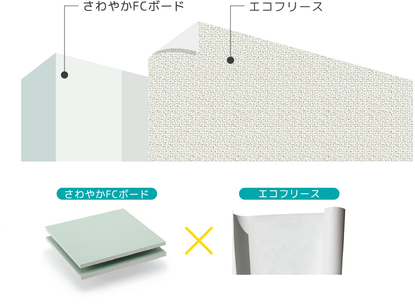 さらりウォールは株式会社ナガイの通気性に優れるフリース素材の環境壁紙「エコフリース」と、チヨダウーテ株式会社の調湿・ホルムアルデヒド吸着分解機能付きせっこうボード「さわやかFCボード」を組み合わせた高性能壁です。